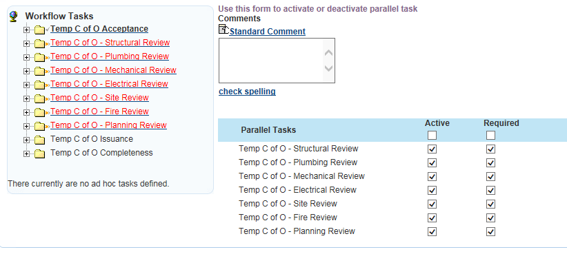 Go to the Related Record Page in the Record List to find your Temp C of O. Select your TCO permit and go to the Workflow page in the Record List. Select the Status of Temp C of O Accepted to move forward. In this task you will fill out the portion of the building that the TCO applies to as well as the length of time that it is valid for. Once you click on submit, a listing of parallel Review tasks will populate. See attached screenshot.