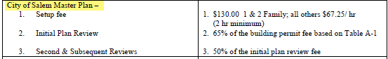 - Master plan review – second and subsequent submittals: this fee is a percentage and would be charged in place of the standard plan review fee. This fee to date for almost all agencies using it, has been set at 50% of the initial plan review fee (the Structural Plan Review fee that was charged in the initial full review of the master plan itself) – you can however, set this percentage-based fee at whatever rate you decide, as the % of the initial full review.