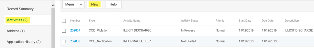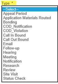 | The Activity Types of Appeal Period, Application Materials Routed, Hearing, and Notification were developed for Planning and include additional fields to allow you to record specific details on these such as Appeal Deadline, Hearing Type, Hearing Date, Notification Date and Type. Bonding was developed for Public Works to record important bond details such as Bond Number, Date Bond Released, Bond Expiration. COD_Notification and COD_Violation were developed specifically for Code Enforcement inside the Planning Module and are integral to successfully managing Code cases in the system. The other Activity Types are generic in nature and can be used as appropriate, in any module, to track inbound/outbound phone calls, important emails sent/received, status checks done, meetings held, etc. Any of the Activity Types are able to be used in any module should you determine a good fit or business case. |