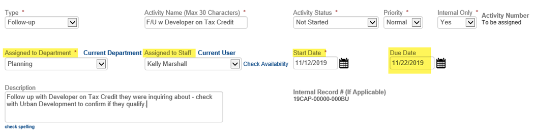 The assignment options in Activities can be very powerful. The Assigned to Department and Assigned to Staff fields automatically default to the logged in user adding the activity, as well as the Start Date and Due Date fields default to current date when added. However, you can change these fields to assign the task to another user and you can set the Due Date to a future date that the task needs to be completed by.