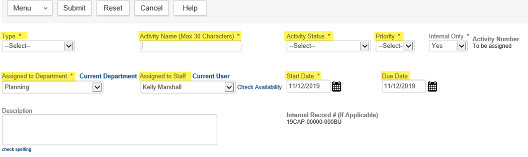Activities are used to document for the permanent record, all the administrative tasks and work that was done on the record/project - in cooperation with the Workflow tasks. The Activities tab shows in all record types across Modules – Building, Planning, Public Works, and Onsite – this is where Activities can be added to a specific record. Activities can be used to document things you’ve already done for the record, to set ‘tickler’ reminders to yourself or other staff, and to assign administrative work to other staff on a given record or project, ie. while you might be the Planner of record on a given Planning Application, perhaps there is a Planning Tech on your team that is responsible for sending out all the Planning Action notifications to property owners – you can use an activity to document, remind, and assign this administrative task to the Planning Tech.