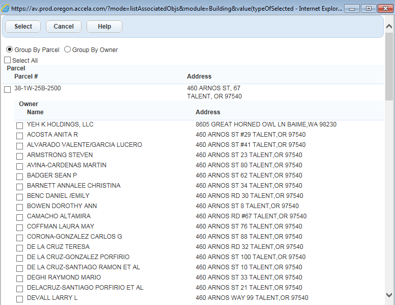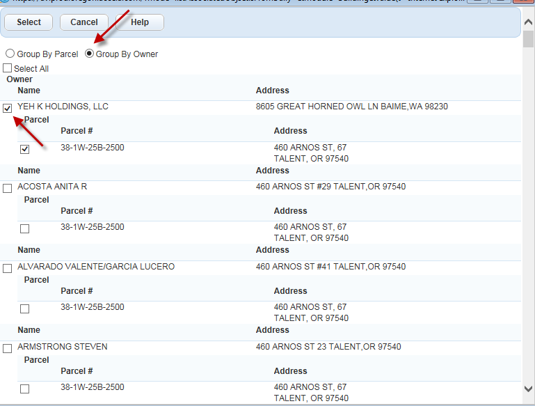 The default is to show results grouped by Parcel. In that view, if you check mark the Parcel number, it will check mark all of the Owners. If you check mark just the Owner, it will not pull in the Parcel information. However, if you select the Group By Owner option, you will be able to select the individual Owner, Parcel and Site Number without having to go through and unchecking them all (see screen shot entitled Group By Owner). This is just a little tip to save some time.